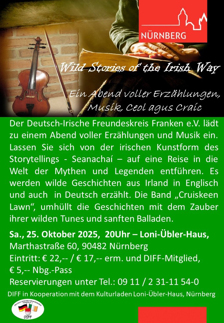 Ein großes Dankeschön geht an alle die am Samstagabend beim Storytelling im Loni-Übler-Haus waren. Ich glaube wahrgenommen zu habe, dass die Stories, die tolle Musik von Cruiskeen Lawn und den ganzen Abend euch allen, die gekommen seid, sehr gut gefallen hat und euch Spass bereitet hat. Nicht nur weil man es euch angesehen und gehört hat, sondern durch die wunderbaren kurzen Unterhaltungen die am Ende stattgefunden haben. Da wissen wir wofür die viele Arbeit sich gelohnt hat, für euch und für uns.